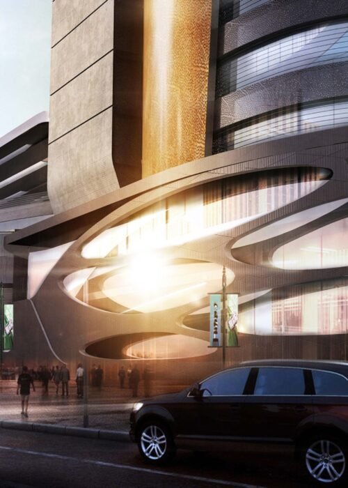 • Façade Treatment: The building’s exterior features a combination of materials, possibly including concrete, wood, and glass, giving it a sleek and modern look.