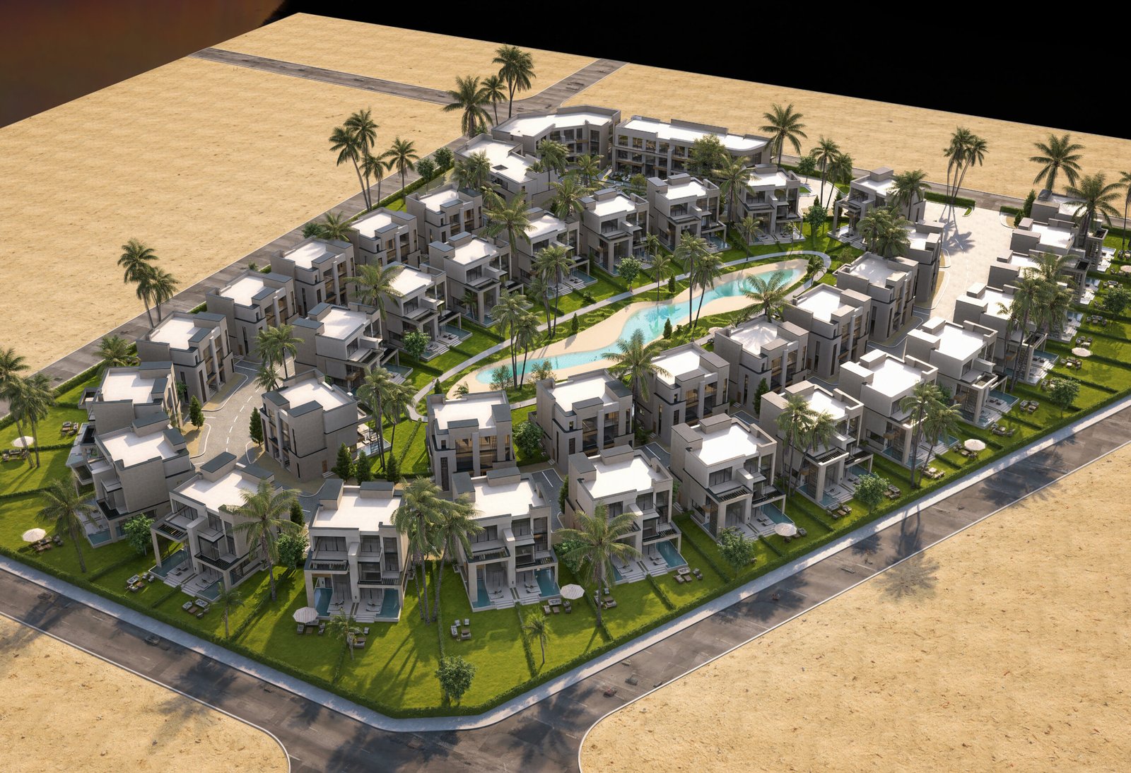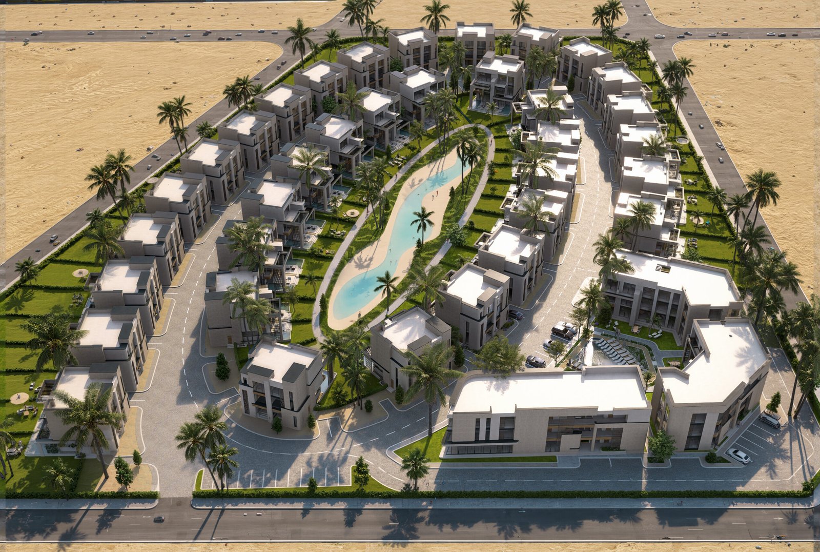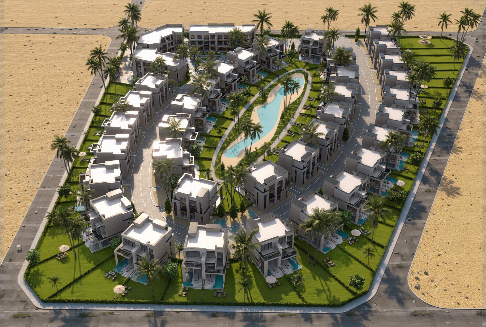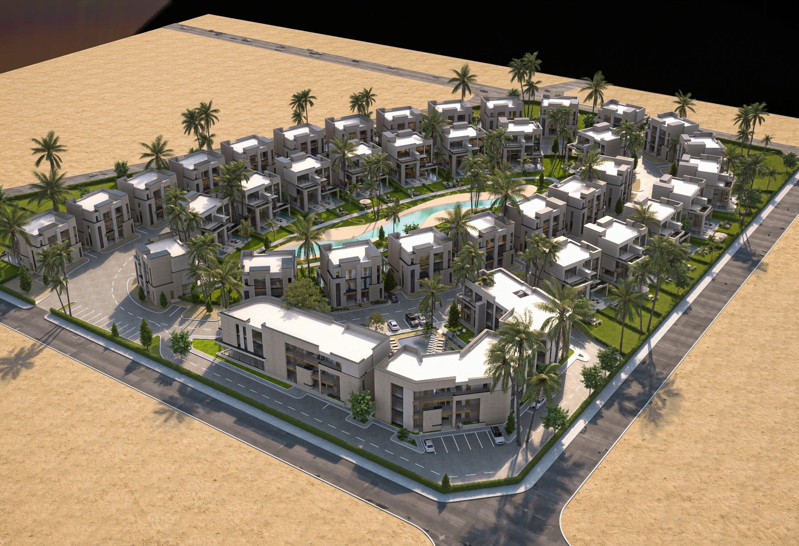 • The Swimmable Lagoon (Hydrological Spine): Water is treated as the project’s lifeblood. The philosophy utilizes a central swimmable lagoon as a natural heat sink, providing evaporative cooling for the entire compound and serving as a shimmering, reflective anchor for the sandy-toned structures.