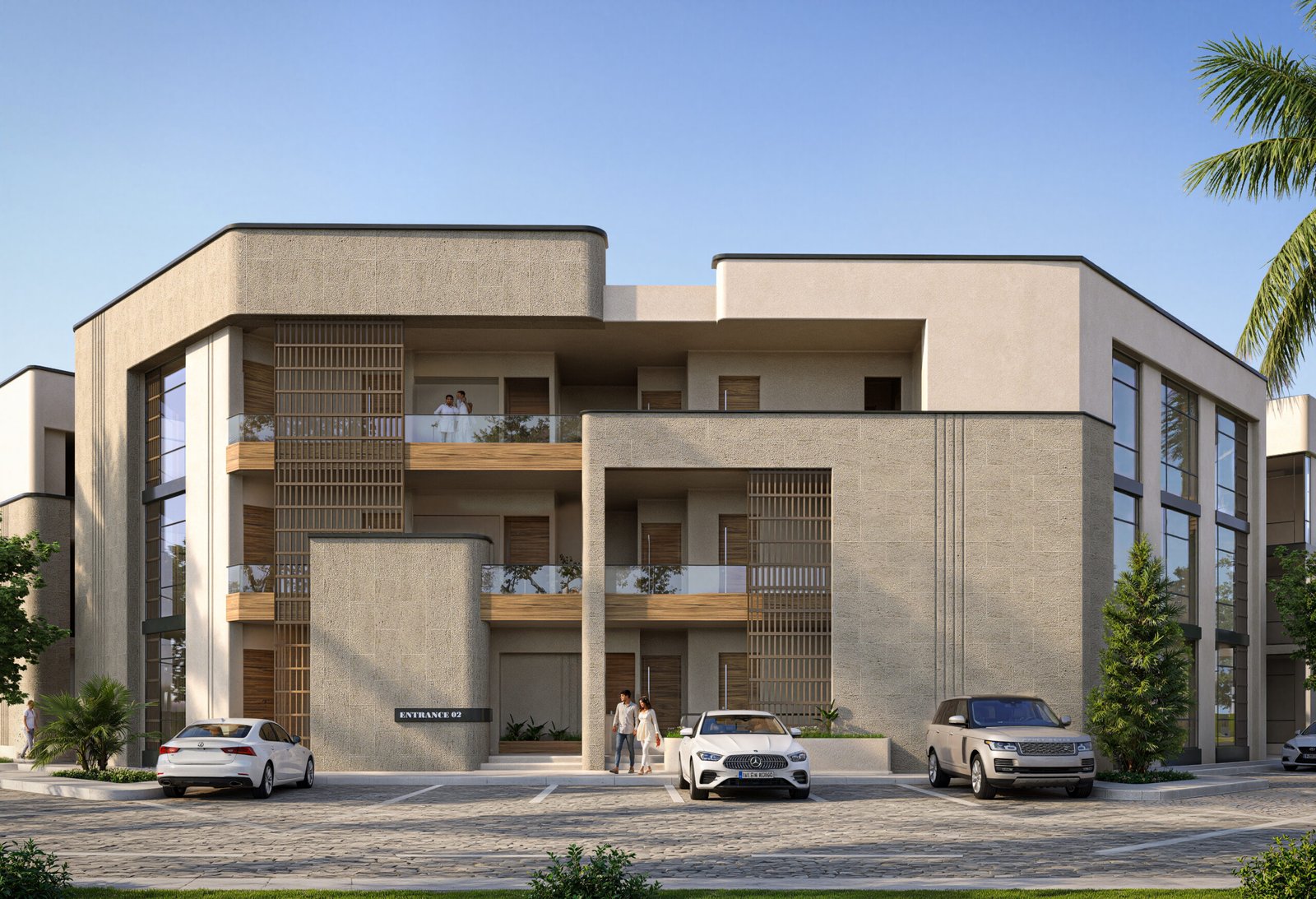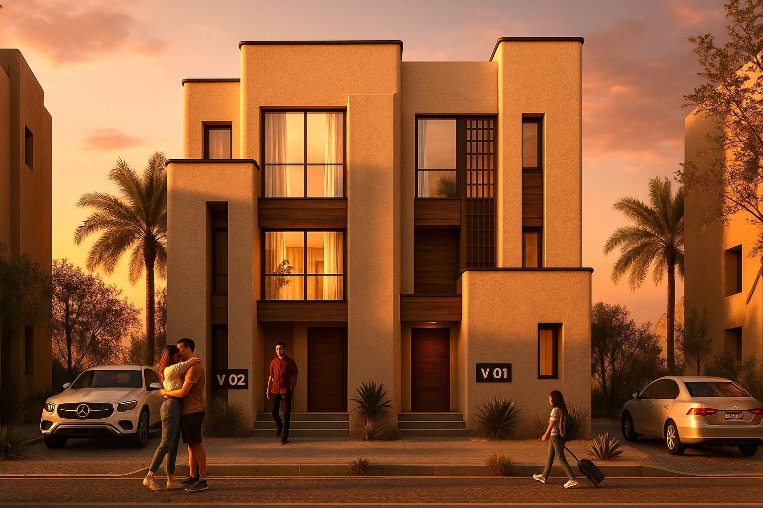 • Interior-Exterior Fusion: The design emphasizes "Vast Terraces" and deep architectural recesses. These "Exterior Rooms" provide essential passive shading, allowing residents to enjoy floor-to-ceiling desert views without the discomfort of direct solar heat gain.